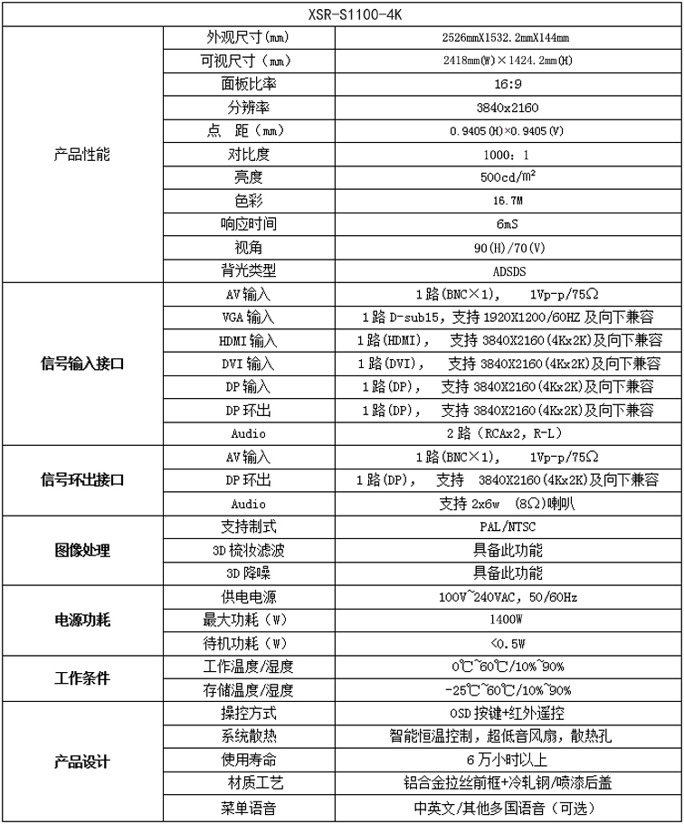 XSR-S1100-4K是新視銳一款110寸4K超高清液晶監視器,分辨率為3840px ×2160px;其采用國際知名品牌液晶面板(如:LG、三星、夏普等)、頂級元器件材料,支持7x24小時不間斷運行,壽命高達60000小時;其搭載世界先進的視頻圖象處理芯片;自動色彩引擎CMM-6,確保色彩還原達到極至;支持多種信號輸入、環出。